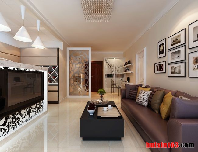 在客厅里面主要是沙发和茶几占用了比较大的空间,通过将沙发靠墙摆放,能够让空间得到更加合理的运用。棕色的真皮沙发搭配黑色的简约风格的茶几,在茶几和电视之间保留一个一米见宽的通道,在看电视的时候刚好保持在一个比较舒服的距离。电视背景墙的后边就是厨房,厨房和客厅之间保持了一个比较通畅的格局,厨房的半面墙壁刚好充当了电视背景墙,在电视背景墙上的灯光,能够顾及到厨房和客厅两个空间,也是一个比较节能的做法。在电视背景墙上采用黑白两色的马赛克拼接出来一些精美的花纹,看起来也比较有质感。在入户门的位置采用透明的夹花玻璃作为玄关,能够营造出若隐若现的效果,也算是比较独特的创意了。