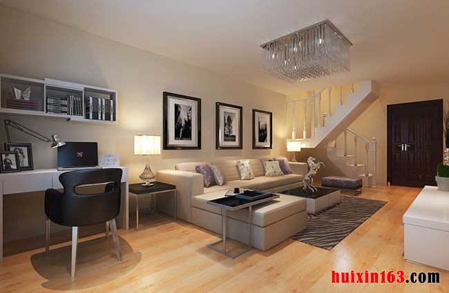 客厅装饰给人最深的印象就是对空间的层次感的把握,在客厅的顶面上安装了一个立方体造型水晶灯,线条简洁硬朗,良好的透光性也让空间的光线层次更加的丰富。子啊电视背景墙上采用对称的装饰设计,中央是浅黄色的花纹的墙纸,两边是白色的石膏板,石膏板呈现出对称的结构,搭配简约造型的电视柜,整个电视背景墙的图像就像是一个展翅飞行的小鸟。在客厅的电视背景墙的旁边一个银色的玻璃球串造型的小花盆,充满了现代设计的魅力。三种不同色彩的休闲沙发环绕着着黑色镜面造型茶几,在简约明快的线条中体现出一些休闲的氛围。