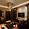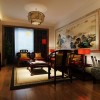 在客厅的地面上铺设了深色的实木地板,搭配黑色的中式圈椅以及罗汉塌跟人一种稳重典雅的感觉。在墙面上采用石膏板制作出一些层次分明的线条,张挂上一幅意境深远的中国山水画搭配优雅华贵的宫灯以及带有回形图案的地毯,在沙发的旁边放置了一个青花瓷的坛子,在坛子里面存放一些卷轴,更加深了客厅古色古香的感觉。在入户门的位置采用了镂刻雕花板作为玄关,结合了古典与现代的感觉。