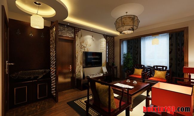 在客厅的地面上铺设了深色的实木地板,搭配黑色的中式圈椅以及罗汉塌跟人一种稳重典雅的感觉。在墙面上采用石膏板制作出一些层次分明的线条,张挂上一幅意境深远的中国山水画搭配优雅华贵的宫灯以及带有回形图案的地毯,在沙发的旁边放置了一个青花瓷的坛子,在坛子里面存放一些卷轴,更加深了客厅古色古香的感觉。在入户门的位置采用了镂刻雕花板作为玄关,结合了古典与现代的感觉。