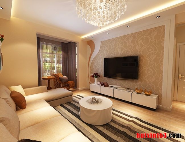 在客厅的顶面上两道平行的灯带散发出的柔和的光线打在墙上显示出柔美均匀的光晕。在客厅的顶面中央安装着一盏吸顶灯,在吸顶灯的周边安装了一圈精美的金黄色的挂饰,将吸顶灯打造出吊灯的感觉。在电视背景墙上采用欧式的墙纸装饰,在墙纸的周边采用石膏板打造出柔和光滑的曲线造型,与简约风格的白色的电视柜形成呼应。在吊灯的下面摆放着一个白色的原型茶几,在茶几的侧面有一个缺口,设计感十足,同时也可以在茶几的下面存储一些小的物件。