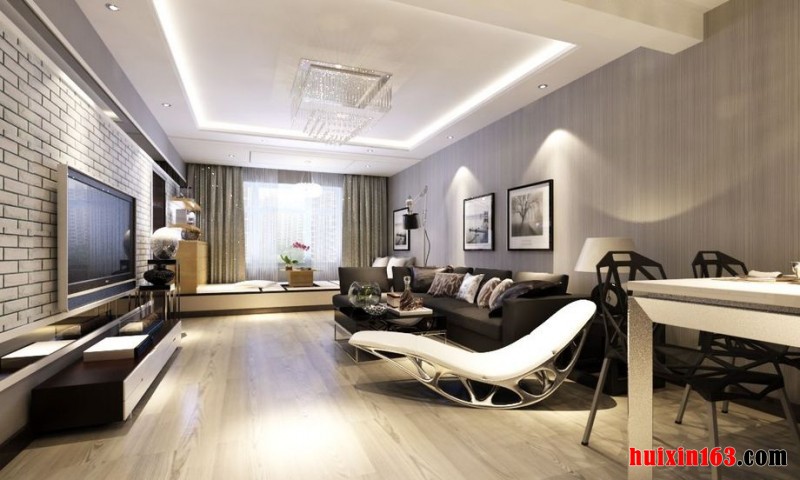 在客厅的电视背景墙上采用文化砖进行装饰,在墙面的顶部采用一条镜子进行装饰,电视背景墙旁边的卧室门也被包含在了电视背景墙中,电视柜上边的隔板几乎和墙面的长度等长,在加上顶面的镜子反射的效果,坐在沙发上观看电视,就像是面对着一栋室外的房子,让人感觉心情更加的舒畅。在顶面上采用了大方简洁的石膏板吊顶结构,配合明亮的灯带环绕房顶一周,在室内射下柔和靓丽的光线。在地面上是原木色的实木地板,搭配现代感十足的沙发和茶几,形成一种跳跃的感觉。