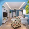 在客厅里面到处充满了柔美的线条,顶面上是一个圆角的方形吊顶结构,周边镶嵌上一圈明亮的灯带,环绕着中心的一盏黑色的铁艺吊灯,搭配墙面上的白色的隔板和随处摆设的一些小的绿植,让空间里面多了一些清新的自然气息。在电视背景墙上采用喷白的文化砖装饰,在电视背景墙旁边也采用了一扇白色的门,让空间感觉浑然一体。在地面上铺设的是深黄色的仿古砖,搭配实木花纹的凳子和田园花纹的布艺沙发让空间里面多了一些清新的田园风气。阳台和客厅之间的蓝色的垭口与白色的墙面相对比,打造出一些淡淡的地中海的感觉。