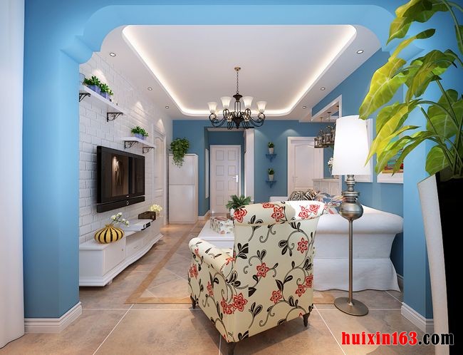 在客厅里面到处充满了柔美的线条,顶面上是一个圆角的方形吊顶结构,周边镶嵌上一圈明亮的灯带,环绕着中心的一盏黑色的铁艺吊灯,搭配墙面上的白色的隔板和随处摆设的一些小的绿植,让空间里面多了一些清新的自然气息。在电视背景墙上采用喷白的文化砖装饰,在电视背景墙旁边也采用了一扇白色的门,让空间感觉浑然一体。在地面上铺设的是深黄色的仿古砖,搭配实木花纹的凳子和田园花纹的布艺沙发让空间里面多了一些清新的田园风气。阳台和客厅之间的蓝色的垭口与白色的墙面相对比,打造出一些淡淡的地中海的感觉。