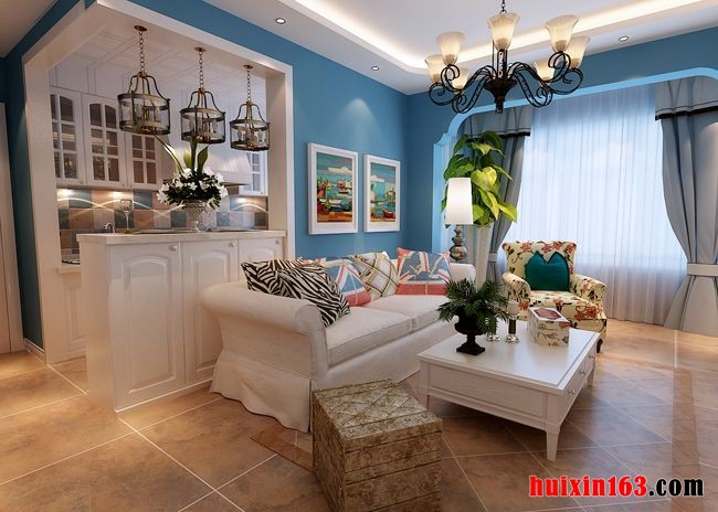 在客厅里面到处充满了柔美的线条,顶面上是一个圆角的方形吊顶结构,周边镶嵌上一圈明亮的灯带,环绕着中心的一盏黑色的铁艺吊灯,搭配墙面上的白色的隔板和随处摆设的一些小的绿植,让空间里面多了一些清新的自然气息。在电视背景墙上采用喷白的文化砖装饰,在电视背景墙旁边也采用了一扇白色的门,让空间感觉浑然一体。在地面上铺设的是深黄色的仿古砖,搭配实木花纹的凳子和田园花纹的布艺沙发让空间里面多了一些清新的田园风气。阳台和客厅之间的蓝色的垭口与白色的墙面相对比,打造出一些淡淡的地中海的感觉。
