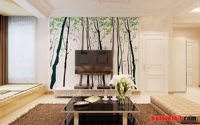 在客厅的电视背景墙上采用一幅清新宜人的风格的小树林的画面作为装饰,为空间带来了几分清新自然的气息。在窗子的位置设计了一个巨大的飘窗和地台,光线充足,刚好靠近电视,就和沙发一起将电视区域围合起来,形成一个比较温馨优雅的小空间。不锈钢框架,墨色玻璃桌面的茶几为空间增添了些许现代自然的时尚感。