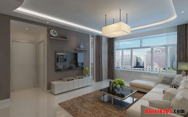 客厅采用了浅灰色和白色作为房间的主色调,给人一种沉稳雅致的感受。在客厅的顶面上设计了一个带有弧形的灯带,环绕着一个盒子造型的吊灯,美和硬朗的线条相辅相成。环绕着灯带的是一圈明亮的射灯,让客厅里面的光线非常的均匀,而且富有层次感。在客厅的电视背景墙上采用灰色作为主色调,在墙面上安装了两个不同高度的隔板,摆放一些精美的瓷器,给人一种错落有致的感受。