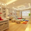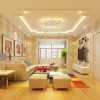 在客厅的顶面上装饰的灯带具有非常明显的缺角正方形的特点,在这点上兼顾了中式和欧式的特色。灯带环绕位置的中央点上安装了一盏明亮的水晶灯,经过水晶球对光线的反射效果,呈现出非常唯美的光影感觉。在地面上采用浅黄色的条状的装饰地板,层次感非常的清晰,同时呈现出一些立体的感觉。在沙发后面的墙上装饰了浅黄色的欧式花纹的墙纸,在顶面射灯光线的照射下,营造出一些美丽的光晕。